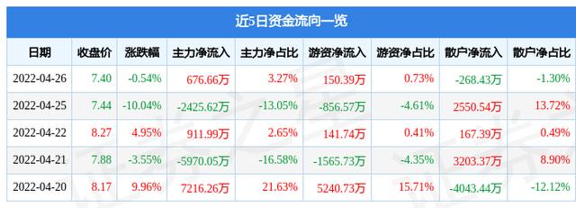 资金流向数据方面,4月26日主力资金净流入676.66万元,游资资金净流入150.39万元,散户资金净流出268.43万元。