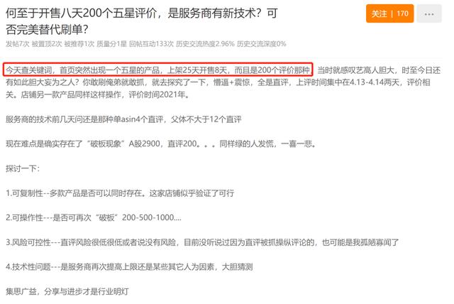 AMZ123了解到,日前,有卖家在论坛上反映,在查关键词时首页突然出现一个产品,上架25天开售8天,就有200个五星评论,全是直评,并且上评时间集中在4.13-4.14两天