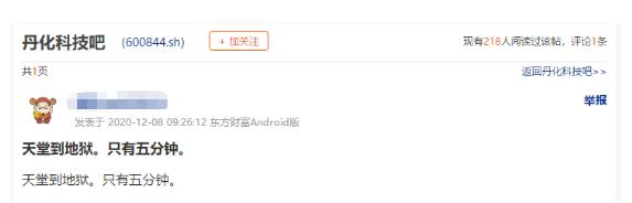 丹化科技极端的走势,在股吧中炸了锅。有网友称,从天堂到地狱,只有5分钟。