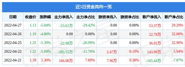 资金流向数据方面,4月27日主力资金净流出53.61万元,游资资金净流入0.0万元,散户资金净流入53.37万元。