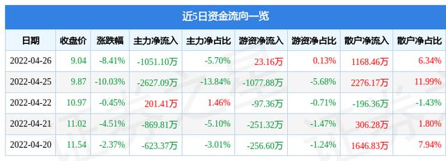 资金流向数据方面,4月26日主力资金净流出1051.1万元,游资资金净流入23.16万元,散户资金净流入1168.46万元。