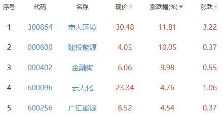 其中,南大环境、建投能源、金融街、云天化、广汇能源位列板块涨幅前五位,涨幅分别为11.81%、10.05%、9.98%、4.76%、4.54%。