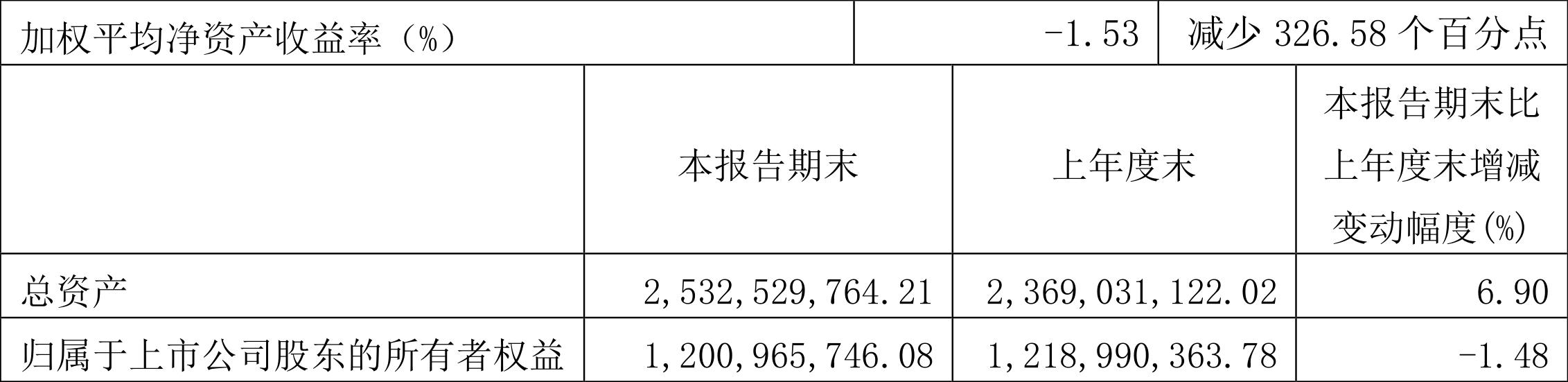 2022年一季度,公司加权平均净资产收益率为-1.53%,同比下降2.21个百分点,环比增长22.01个百分点。