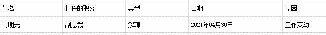 此外,美的集团于2021年4月29日发布的《关于公司高级管理人员离任的公告》显示,公司于近日收到公司副总裁肖明光递交的书面工作调动说明,肖明光因公司内部工作调整原因不再担任副总裁职务。根据《公司法》等相关规定,肖明光的工作调动说明自送达公司董事会起即刻生效,肖明光仍在公司担任其他职务。美的集团2021年半年报显示,肖明光已因工作变动原因被解聘。