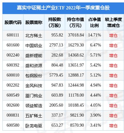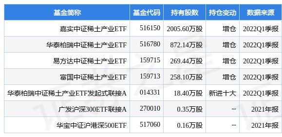 根据2022Q1季报基金重仓股数据,重仓该股的基金共5家,其中持有数量最多的基金为嘉实中证稀土产业ETF。嘉实中证稀土产业ETF目前规模为25.17亿元,最新净值0.9276(4月26日),较上一交易日下跌2.76%,近一年下跌0.8%。该基金现任基金经理为田光远。田光远在任的公募基金包括:嘉实恒生中国企业ETF(QDII),管理时间为2021年6月4日至今,期间收益率为-37.57%;嘉实中证软件服务ETF,管理时间为2021年6月4日至今,期间收益率为-37.35%;嘉实中证科创创业50ETF,管理时间为2021年6月25日至今,期间收益率为-45.11%。