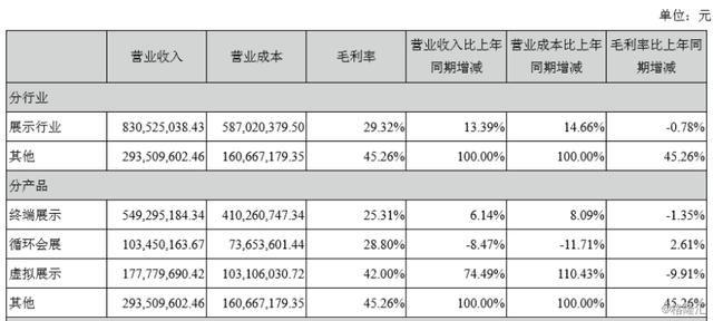 其中,主要业务终端展示业务营收同比仅增长6.14%为5.49亿元,循环会展营收同比下滑8.57%至1.03亿元,虚拟展示同比增长74.49%为1.78亿元;其它业务(即房地产业务)同比增长100%,实现营收为2.94亿元。