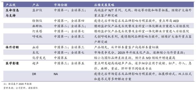 浦银国际则指出,目前国内医疗器械企业仍多以单科室产品销售为主,部分二三线龙头则处于由单科室产品线逐步拓展至多科室,迈瑞产品线完整程度更高,在销售过程中可更好满足医院对多科室整体解决方案而非单件医疗设备的需求,综合竞争优势优于国内同行。