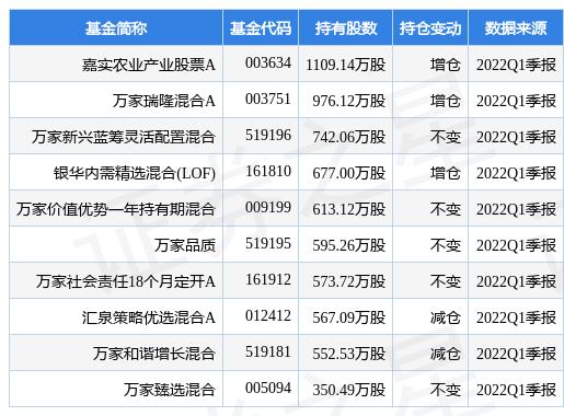 根据2022Q1季报基金重仓股数据,重仓该股的基金共27家,其中持有数量最多的基金为嘉实农业产业股票A。嘉实农业产业股票A目前规模为25.89亿元,最新净值2.1033(3月22日),较上一日上涨0.82%,近一年下跌4.32%。该基金现任基金经理为吴越。吴越在任的公募基金包括:嘉实消费精选股票A,管理时间为2020年12月9日至今,期间收益率为-5.9%;嘉实新起航混合,管理时间为2021年10月22日至今,期间收益率为-3.98%;嘉实内需精选混合A,管理时间为2022年1月6日至今,期间收益率为-0.99%。