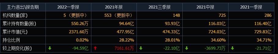 前十大流通股东累计持有股数在去年一季度末为97.72亿股,经过连续三个报告期的减仓,这一数值在2021年末为82.31亿股,减少了15.41亿股;机构投资者的数量也由2020年报显示的924家减少至2021年报显示的553家,减少了371家。
