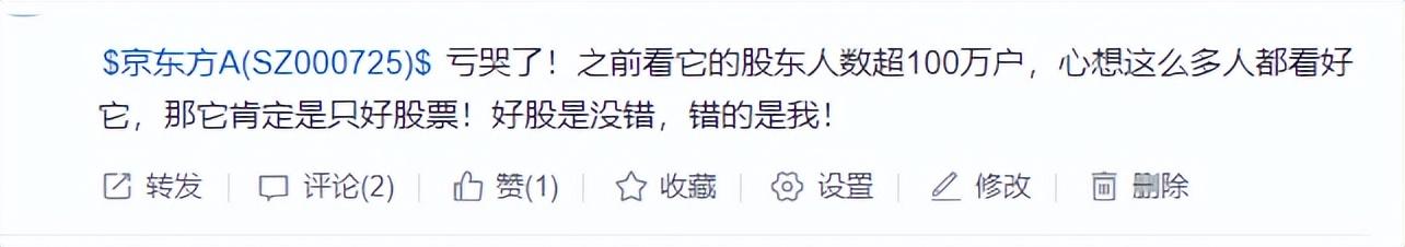 可是从京东方A的股价走势后视镜角度来看,这些新入场的散户投资者大概率已被套。在网上,有投资者写道,“亏哭了!之前看它的股东人数超100万户,心想这么多人都看好它,那它肯定是只好股票!好股是没错,错的是我!”