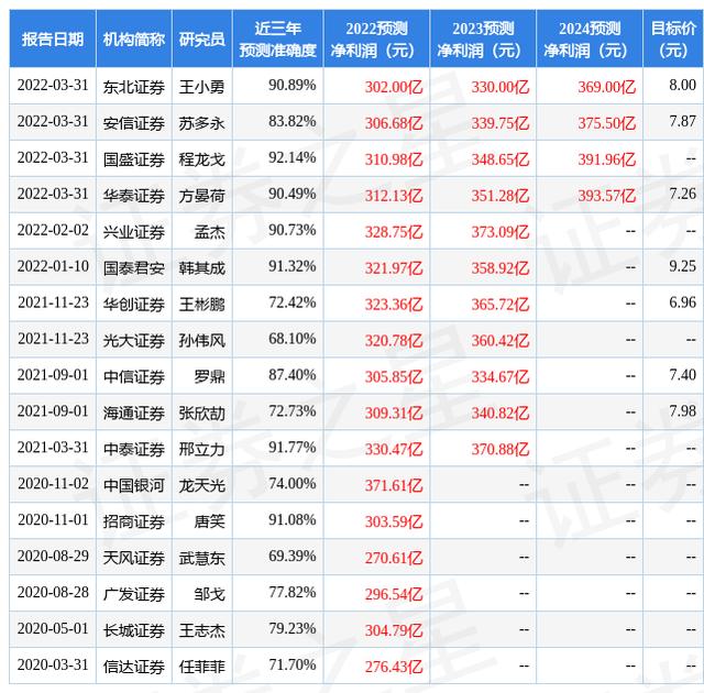 证券之星数据中心根据近三年发布的研报数据计算,国盛证券程龙戈研究员团队对该股研究较为深入,近三年预测准确度均值高达92.14%,其预测2022年度归属净利润为盈利310.98亿,根据现价换算的预测PE为4.8。