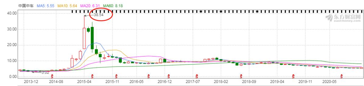 2014年年底,中国南车、中国北车宣布将合并。南北车重组前股价遭遇资本市场爆炒。到2015年4月,曾一度飙到最高点38.54元/股,两家的市值之和接近1400亿美元,甚至超越了波音公司,被网友戏称为中国“神车”。2015年6月8日,重组后的中国中车复牌,股价开始一路下跌,至2021年1月4日,一度下探到5.24元/股。从当年的最高点至今,五年多的时间,股价下降了84.7%。