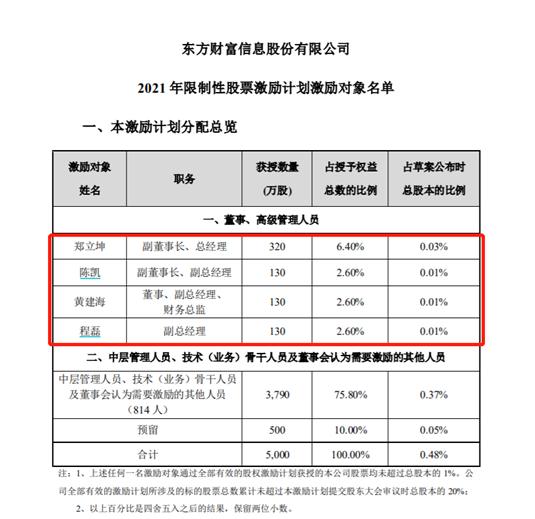 在高管名单方面,包括东方财富副董事长、总经理郑立坤(获授320万股),东方财富副董事长、副总经理陈凯(获授130万股),东方财富董事、副总经理、财务总监黄建海(获授130万股),东方财富副总经理程磊(获授130万股)。