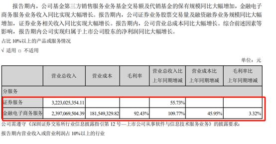 此外,公司基金第三方销售服务业务基金交易额及代销基金的保有规模同比大幅增加,金融电子商务服务业务收入同比实现大幅增长。