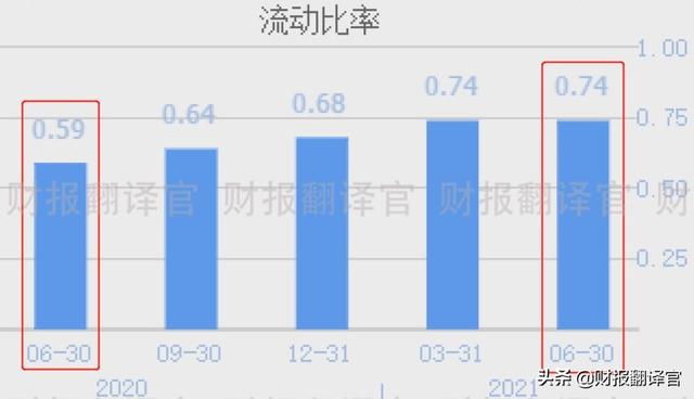 到了2021年第二季度,该公司有100元的短期负债,则对应有74元的流动资产作为保障,流动比率提高了25%。
