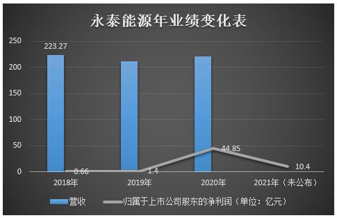 不仅如此,前些年永泰能源的业绩更为惨淡。2018年至2019年,归属于上市公司股东的净利润分别为0.66亿元和1.4亿元。2020年则比较特殊,公司因完成重整工作,实现相关债务重组收益净额约45.1亿元,当期归属于上市公司股东的净利润44.85亿元。