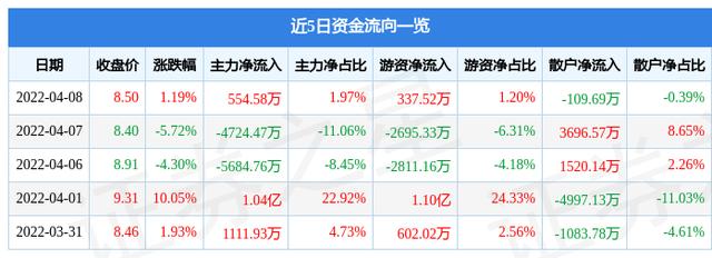 资金流向数据方面,上个交易日主力资金净流入554.58万元,游资资金净流入337.52万元,散户资金净流出109.69万元。近5日资金流向一览见下表: