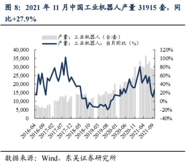 2022年制造业投资有望保持稳定。2021年11月规模以上高技术制造业增加值同比增长15.1%,两年平均增长12.9%;1-11月我国高技术制造业投资同比增长22.2%,两年平均增长17.4%。国开证券预计2022年制造业投资同比增长6.5%左右,投资保持稳定增长对机器人行业需求形成拉动作用。