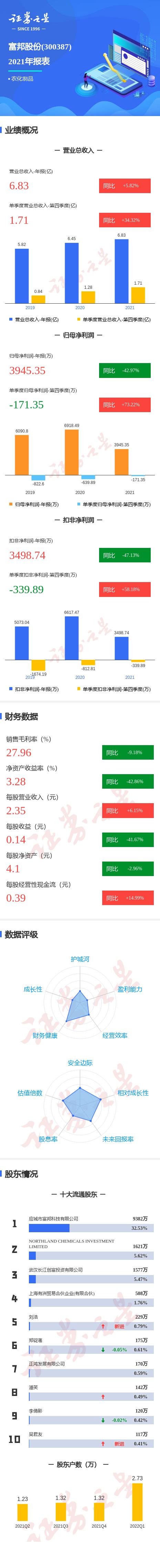 富邦股份2022一季报显示,公司主营收入1.96亿元,同比上升6.05%;归母净利润1348.8万元,同比下降42.95%;扣非净利润1308.52万元,同比下降43.78%;其中2022年第一季度,公司单季度主营收入1.96亿元,同比上升6.05%;单季度归母净利润1348.8万元,同比下降42.95%;单季度扣非净利润1308.52万元,同比下降43.78%;负债率29.46%,投资收益26.68万元,财务费用466.29万元,毛利率25.52%。