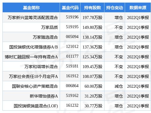 根据2022Q1季报基金重仓股数据,重仓该股的基金共27家,其中持有数量最多的基金为万家新兴蓝筹灵活配置混合。万家新兴蓝筹灵活配置混合目前规模为21.26亿元,最新净值2.347(3月22日),较上一日上涨0.35%,近一年上涨24.76%。该基金现任基金经理为莫海波。莫海波在任的公募基金包括:万家和谐增长混合,管理时间为2015年5月6日至今,期间收益率为167.97%;万家品质,管理时间为2015年8月6日至今,期间收益率为277.69%;万家臻选混合,管理时间为2017年12月20日至今,期间收益率为168.36%。