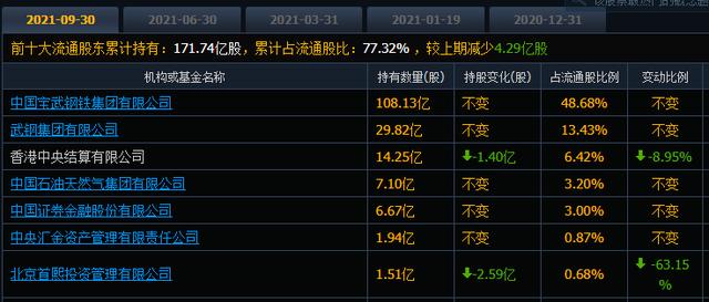 2021年一季度末,前十大流通股东累计持有177.70亿股,累计占流通股比为80.01%,较上期减少了1.63亿股;二季度末,这一数值变为176.03亿股,占比减少至79.26%,较上期减少1.67亿股;最新披露的2021年三季度末,这一数值为171.74亿股,累计占比为77.32%,较上期进一步减少4.29亿股。