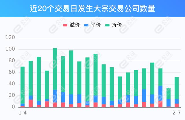 根据沪深交易所最近公布,两市2月7日共52只个股出现大宗交易,成交额为14.61亿元。其中溢价成交6只,平价成交8只,折价成交38只。