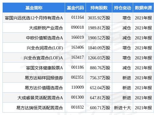 根据2021年报基金重仓股数据,重仓该股的基金共217家,其中持有数量最多的基金为富国兴远优选12个月持有混合A。富国兴远优选12个月持有混合A目前规模为58.51亿元,最新净值0.8499(3月22日),较上一日下跌0.02%,近一年下跌14.92%。该基金现任基金经理为林庆。林庆在任的公募基金包括:富国文体健康股票A,管理时间为2015年5月6日至今,期间收益率为95.8%;富国天恒混合A,管理时间为2022年1月24日至今,期间收益率为-4.94%。