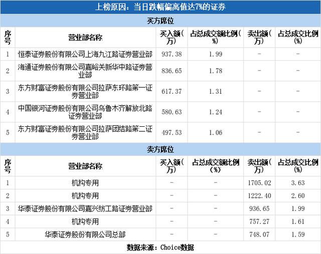 卖五为华泰证券营业总部(非营业场所),该席位卖出748.07万元。近三个月内该席位共上榜668次,实力排名第10。华泰证券营业总部(非营业场所)今日还参与了华润双鹤(净买额-1.42亿元),安记食品(净买额1822.90万元),天龙股份(净买额1725.27万元)等17只个股。