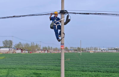 四月的沂蒙大地麦浪翻涌,在临沂费县探沂镇一片绿油油的麦田里,探沂营服中心智慧家庭工程师王家育正攀爬在线杆上…