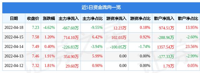 资金流向数据方面,上个交易日主力资金净流出667.6万元,游资资金净流入12.23万元,散户资金净流入974.51万元。近5日资金流向一览见下表: