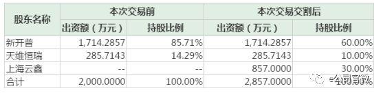 本次交易前,完美数联注册资本为2000万元,新开普持有85.71%股权,天维恒瑞持有14.29%股权。交易完成后,完美数联注册资本将增加至2857万元,新开普持有60%股权,天维恒瑞持有10%股权,上海云鑫持有30%股权。