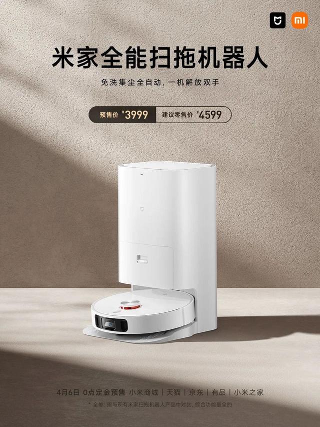 【小米推出米家全能扫拖机器人:洗拖烘一体】小米宣布推出米家全能扫拖机器人,4月6日首发3999元,免洗拖布热烘干,自动集尘月抛式尘袋,支持结构光避障、LDS &视觉、3D地图导航等。(新浪家居)
