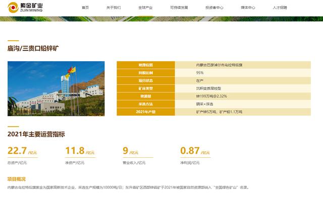在紫金矿业官方网站显示,紫金矿业持有三贵口铁(铅)锌矿95%股份。该矿年产锌5万吨,铅1.1万吨,2021年营业收入9亿元,总资产达到22.7亿元,净利润0.87亿元。