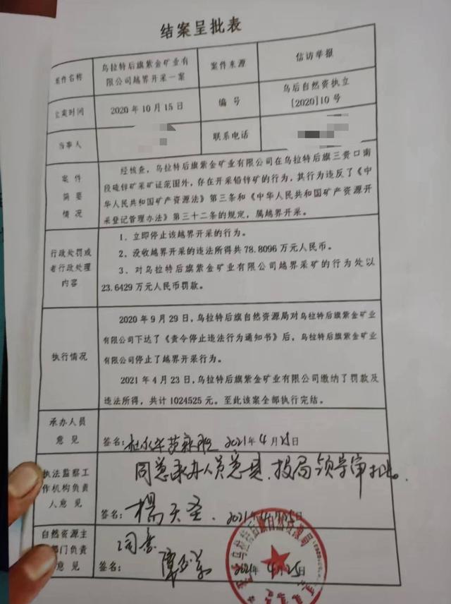 一份《结案呈批表》显示,2020年10月15日,乌拉特后旗自然资源局对信访举报立案调查,经认定,该矿南矿段存在采矿证范围外开采铅锌矿行为,其行为违反了《中华人民共和国矿产资源法》第三条和《中华人民共和国矿产资源开采登记管理办法》第三十二条的规定,属越界开采。相关资料显示,当时认定的越界开采矿石量2988.41吨,金属量69.93吨。2021年4月23日,执法部门对该矿区作出没收越界开采违法所得78.8096万元,行政处罚23.6429万元,共收缴罚没款102.4525万元。