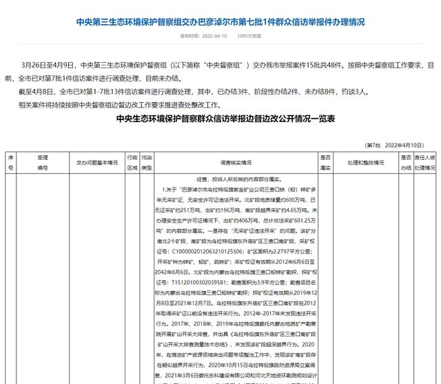 4月10日,内蒙古巴彦淖尔市生态环境局公布了中央第三生态环境保护督察组交办巴彦淖尔市的一件群众信访举报件办理情况。内容涉及乌拉特后旗紫金矿业公司无证、越界开采情况。