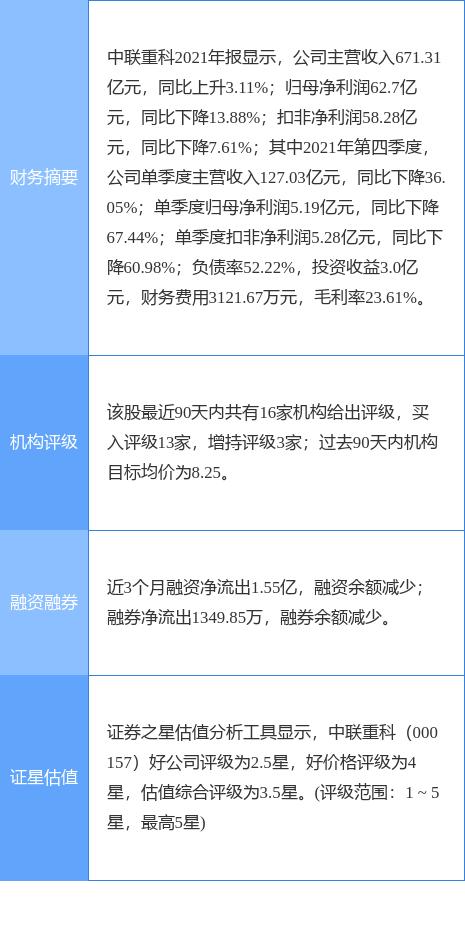 2022年2月8日,浙商证券研究员王华君,李锋发布了对中联重科的研报《中联重科点评报告:拟收购路畅科技控股权;有助发挥业务协同效应》,该研报对中联重科给出“买入”评级。研报中预计 2021-2023 年公司归母净利润为 66/68/70 亿元,同比增长-9%/3%/2%,PE 为 9.5/9.2/9.0 倍,PB 为 1.2/1.0/0.9 倍。维持“买入”评级。证券之星数据中心根据近三年发布的研报数据计算,该研报作者对此股的盈利预测准确度为94.86%。