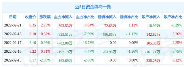 资金流向数据方面,上个交易日主力资金净流入303.53万元,游资资金净流入72.63万元,散户资金净流出18.99万元。近5日资金流向一览见下表: