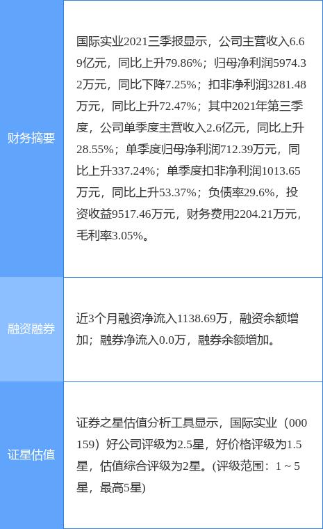 000159股票(000159股票今日行情)2月22日盘中消息,9点48分国际实业(000159)封涨停板。目前价格6.99,上涨10.08%。其所属板块炼化及贸易目前上涨。领涨股为和顺石油。资金流向数据方面,上个交易日主力资金净流入303.53万元,游资资金净流入72.63万元,散户资金净流出18.99万元。近5日资金流向一览见下表:国际实业主要指标及行业内排名如下:国际实业(000159)个股概况:以上内容由证券之星根据公开信息整理,如有问题请联系我们。