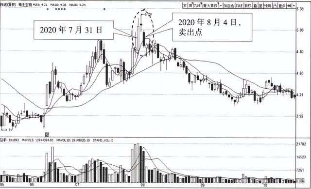 海王生物在上涨行情末期的2020年7月31日、8月3 日和4日这三个连续的交易日里形成了黄昏星形态。