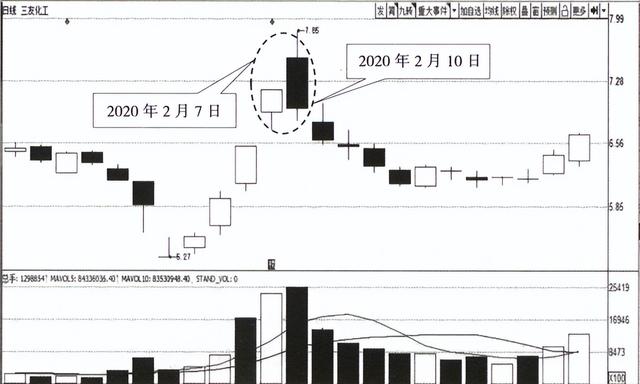 2020年2月7日、10 日,三友化工的日K线图上出现了乌云盖顶形态。