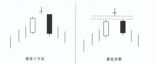 第二,黄昏星形态中,中间的十字星(星线也可以是锤头线、倒锤头线、 十字线、T字线、倒T字线等)实体越小,与阳线之间的跳空距离越大,则未来股价反转向下的概率越大。如果该十字线与前后两根K线之间均出现缺口,就构成了弃婴(舍字线)形态,反转信号更强烈。
