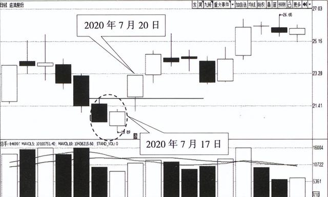 2020年7月16日、17 日 ,应流股份的日K线图上出 现了刺透形态。