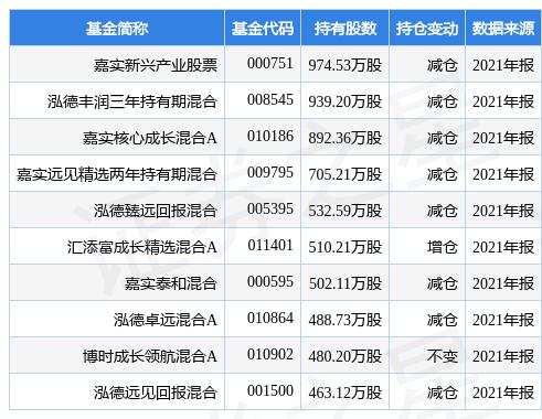 根据2021年报基金重仓股数据,重仓该股的基金共597家,其中持有数量最多的基金为嘉实新兴产业股票。嘉实新兴产业股票目前规模为106.61亿元,最新净值3.913(3月22日),较上一日下跌0.96%,近一年下跌18.78%。该基金现任基金经理为归凯。归凯在任的公募基金包括:嘉实泰和混合,管理时间为2016年3月10日至今,期间收益率为120.22%;嘉实增长混合,管理时间为2018年12月4日至今,期间收益率为92.5%;嘉实瑞和两年持有期混合,管理时间为2020年4月9日至今,期间收益率为6.35%。