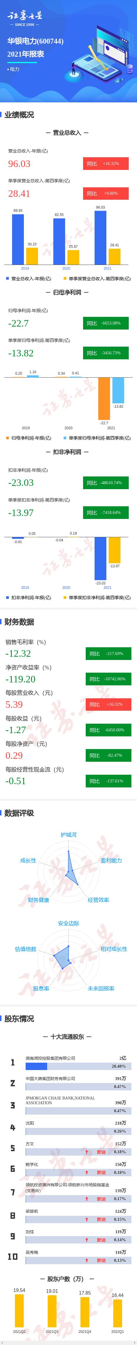 华银电力2021年报显示,公司主营收入96.03亿元,同比上升16.32%;归母净利润-227014.92万元,同比下降6653.08%;扣非净利润-230372.61万元,同比下降48610.74%;其中2021年第四季度,公司单季度主营收入28.41亿元,同比上升9.8%;单季度归母净利润-138231.81万元,同比下降3456.73%;单季度扣非净利润-139741.94万元,同比下降7418.64%;负债率96.66%,投资收益-33955.67万元,财务费用5.11亿元,毛利率-12.32%。