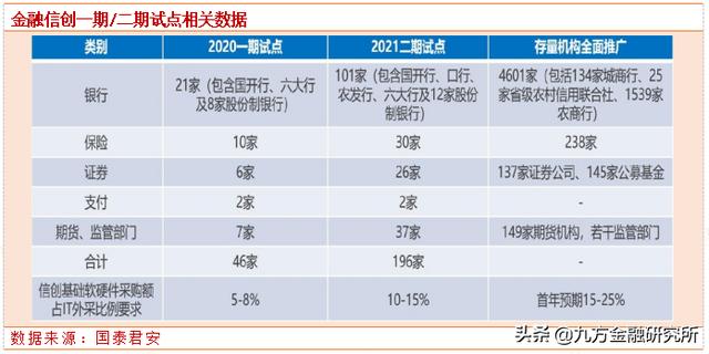 2020年,金融信创一期试点:主要参与者是银行、保险、证券、期货、支付金融的头部机构。参与试点的银行主要为六大国有银行、国开行及八家股份制银行。试点要求信创基础软硬件采购额占到其IT外采的5-8%。