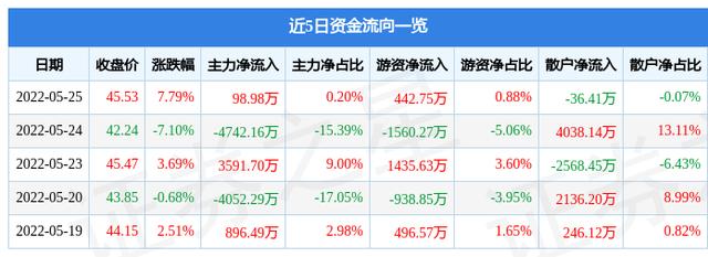 资金流向数据方面,5月25日主力资金净流入98.98万元,游资资金净流入442.75万元,散户资金净流出36.41万元。