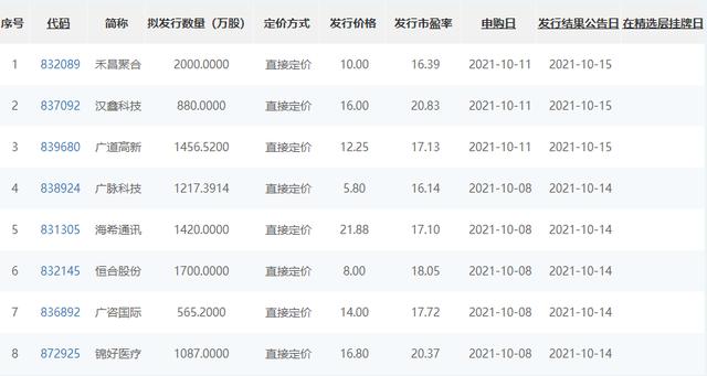 10月8日的5只精选层新股,分别是广脉科技、海希通讯、恒合股份、广咨国际、锦好医疗。10月11日的3只精选层新股,分别为汉鑫科技、禾昌聚合和广道高新。