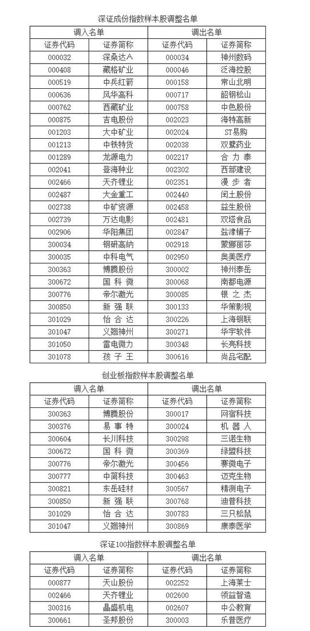 具体来看,深证成份指数样本股调入名单有深桑达A、风华高科、天齐锂业等,调出名单有神州数码、双鹭药业、盐津铺子等。创业板指数样本股调入名单有博腾股份、长川科技、国科微等,调出名单有网宿科技、机器人、三只松鼠等。深证100指数样本股调入名单有天山股份、圣邦股份、晶盛机电等,调出名单有上海莱士、中公教育、领益制造等。