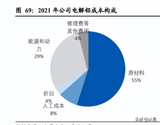 所需电力完全来自自备电厂,电解铝成本较低。电解铝行业发展较为成熟,生产工 艺简单,企业竞争力主要体现在生产成本及销售运输方面。电力费用占电解铝总成 本近 1/3,公司在霍林河地区已经形成煤电铝联动产业链,拥有距离煤炭产地近的自 备电厂,具有电力成本优势。公司自备电厂目前装机容量共 220 万千瓦,具体包括 180 万千瓦火电机组(两台 10 万千瓦、两台 15 万千瓦、两台 30 万千瓦、两台 35 万千瓦)与循环经济示范工程 40 万千瓦就地消纳风电示范项目(总核准 80 万千瓦, 目前正在进行第五期 20 万千瓦风电项目建设)。自备火电机组分布于公司煤矿附 近,煤炭采用皮带运输,为公司煤炭开采过程中的伴生产品,经济性优势明显,并 且环保全部达标,为电解铝行业全国首例煤电铝烟气污染物趋零排放示范工程,环 保优势明显。2021 年,公司电解铝成本为 12125 元/吨,其中电力成本为 3531 元/ 吨,公司每吨电解铝平均消耗约 1.358 万度电,测得公司实际电力成本仅为 0.26 元 /度,低于全国平均燃煤基准价,相比燃煤基准价每吨可节省电力成本约 1456 元。 考虑到国家发改委严禁对电解铝行业实施优惠电价政策,要求工商业电力用户全部 进入电力市场,且高耗能企业市场交易电价原则上不封顶,公司自备电厂优势更加 凸显。电价大幅上涨将进一步优化行业格局,公司作为电力、煤炭完全自供的电解 铝生产商有望从中获益。