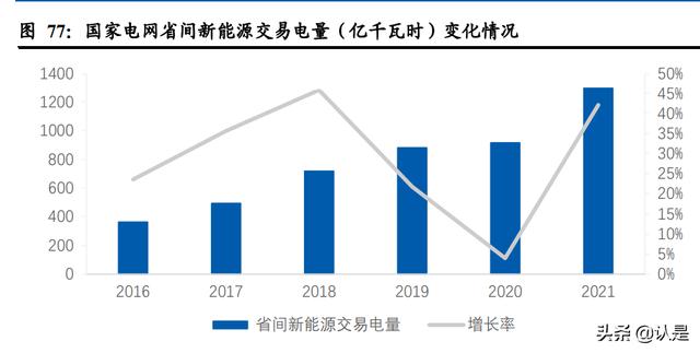 省间电力现货交易规则发布,新能源省间现货交易持续增长。省间电力交易市场是 新能源消纳的重要途径之一,2017 年 8 月 18 日,国家电网启动了跨区域省间富余 可再生能源现货交易试点,新能源省间现货交易量持续增长,从 2016 年 363 亿千 瓦时增长至 2021 年 1300 亿千瓦时,复合增长率达 29.1%,占省间市场化交易电量 20.4%。2021 年 11 月 22 日,国家电网正式印发《省间电力现货交易规则(试行)》, 将交易范围由“跨区省间”扩展到“所有省间”,将交易频率由按五个交易时段开展变 为每两小时开展一次,将市场主体由可再生能源扩展到所有电源类型,并具有电源 属性的标签,能够体系绿色电力的交易价值。随着省间电力现货交易规则进一步完 善,预计新能源省间交易量将进一步增长,一方面有助于提高新能源发电利用率, 另一方面有助于提高绿电交易价值。